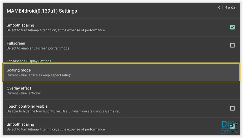 하단으로 쭉 내려서 ' Lansdscape Display Settings ' 항목 아래 있는 ' Scaling mode ' 항목을 눌러 주세요.