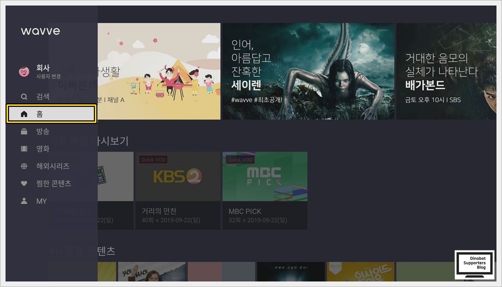 ' 홈 ' 카테고리에서는 가장 빠른 다시보기(Quick VOD)/시청 중 콘텐츠/추천영화/추천 카테고리 등등의 리스트를 제공합니다.