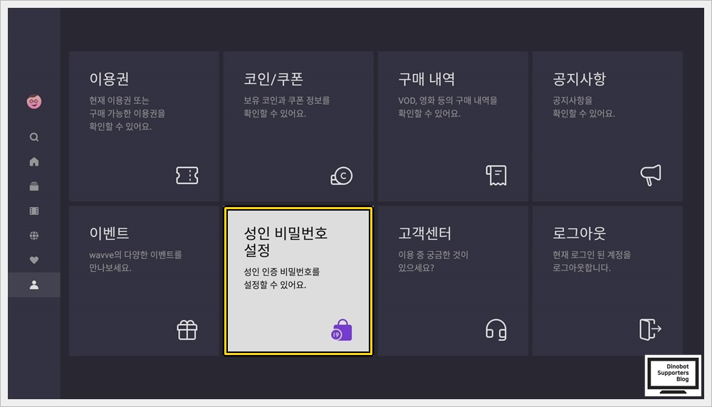 ' MY ' 카테고리로 들어가면 이용권구매/코인&쿠폰 등록/구매 내역/성인 비밀번호설정 등등이 가능합니다.