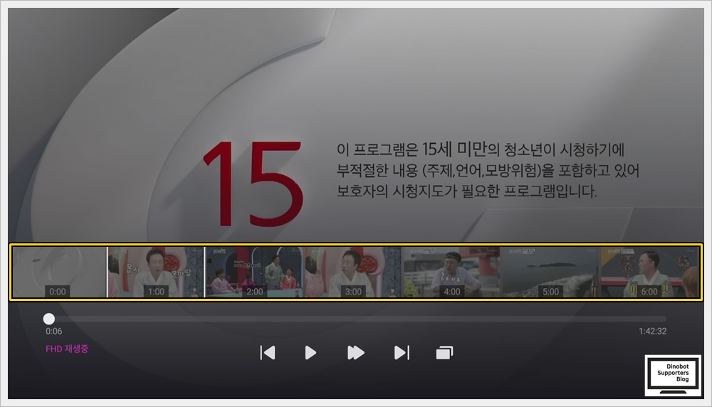 방향키를 위로 올리면 1분 단위로 동영상을 쪼개서 섬네일을 이미지를 표시하여 빠르게 동영상의 이동도 가능합니다.