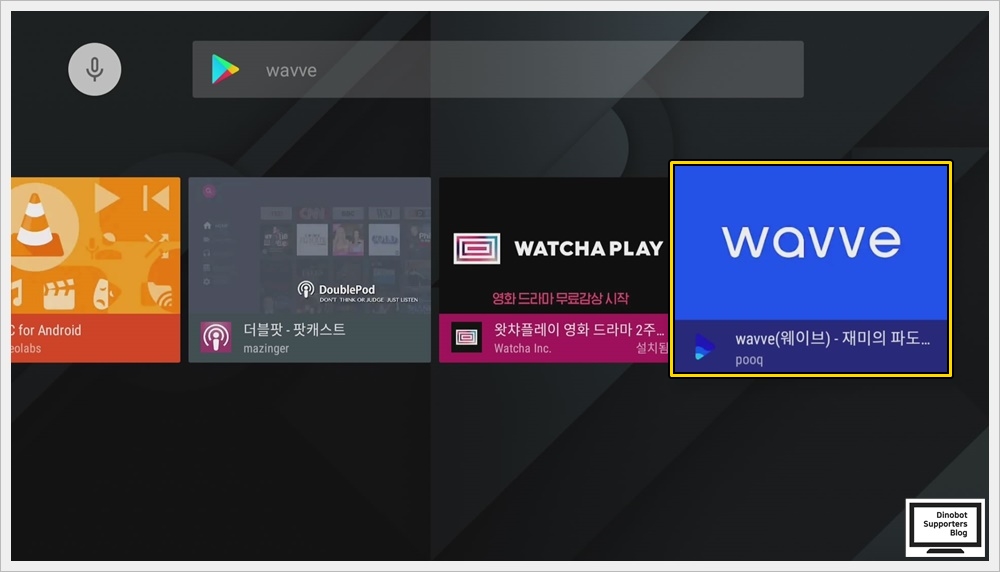 셋톱 내장 구글 플레이 스토어에서 ' WAVVE ' 로 검색합니다. (한글로 웨이브 치면 나오지 않습니다.)