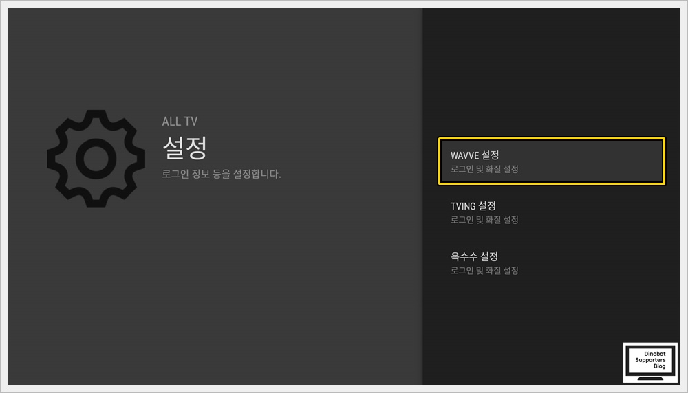 ' 기타 - 설정 ' 으로 접속해서 ' WAVVE 설정 ' 을 누르면 웨이브 아이디 연결 설정이 가능합니다.