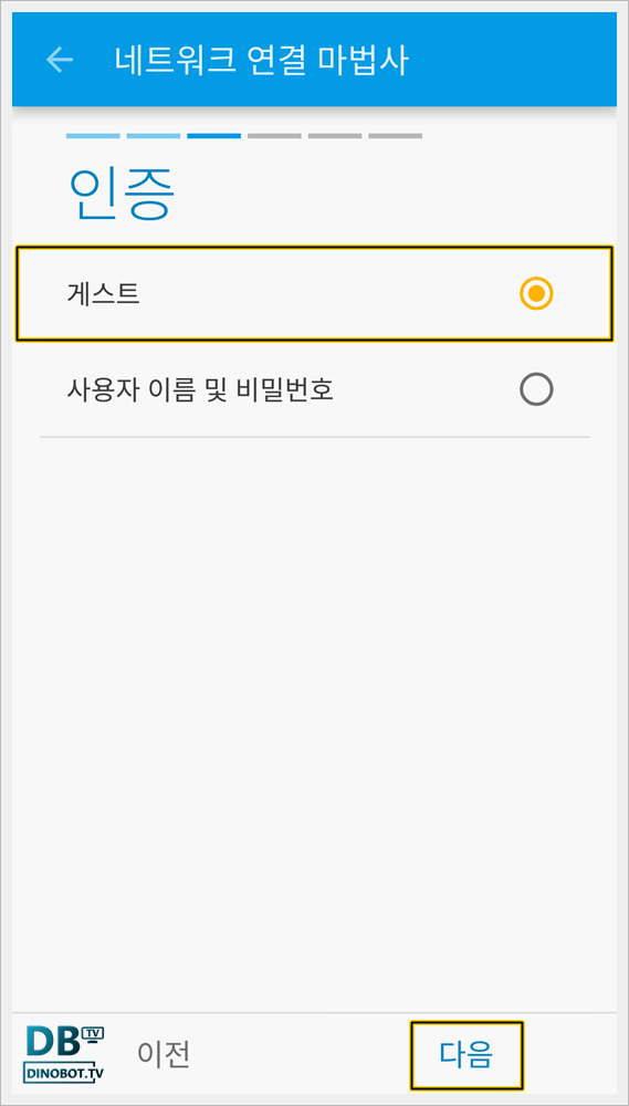 인증에서 [ 게스트 ] 를 선택하고 [ 다음 ] 을 눌러 주세요.