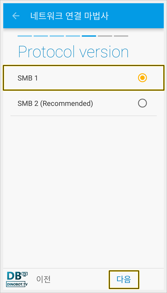프로토콜 버전에서 [ SMB1 ] 을 선택하고 [ 다음 ] 을 눌러 주세요.