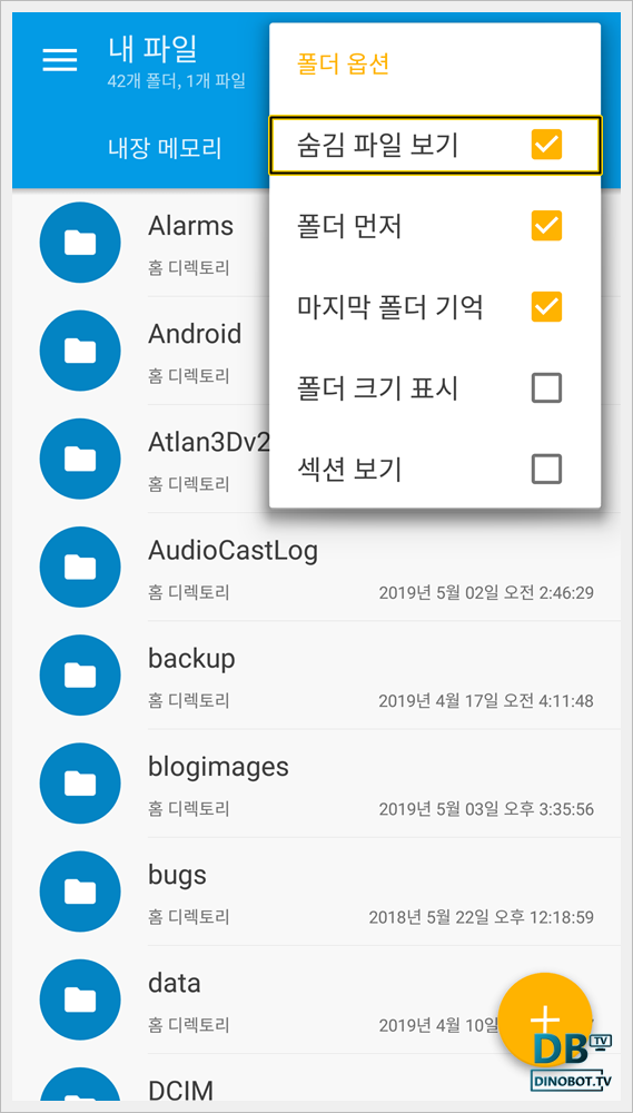 [ 숨김 파일 보기 ] 를 눌러서 활성화 시켜 줍니다.