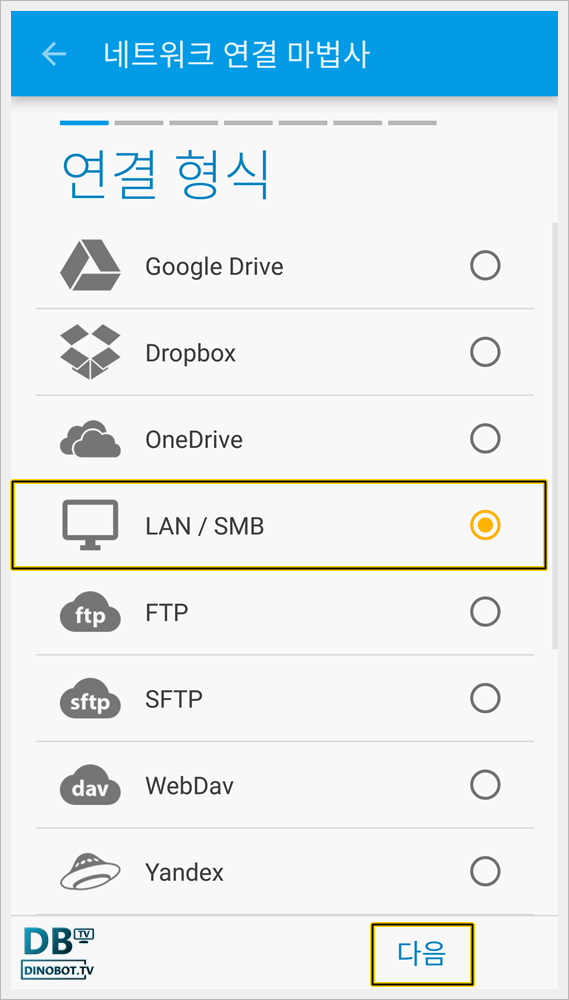 연결 형식에서 [ LAN / SMB ] 를 선택하고 [ 다음 ] 을 눌러 주세요.