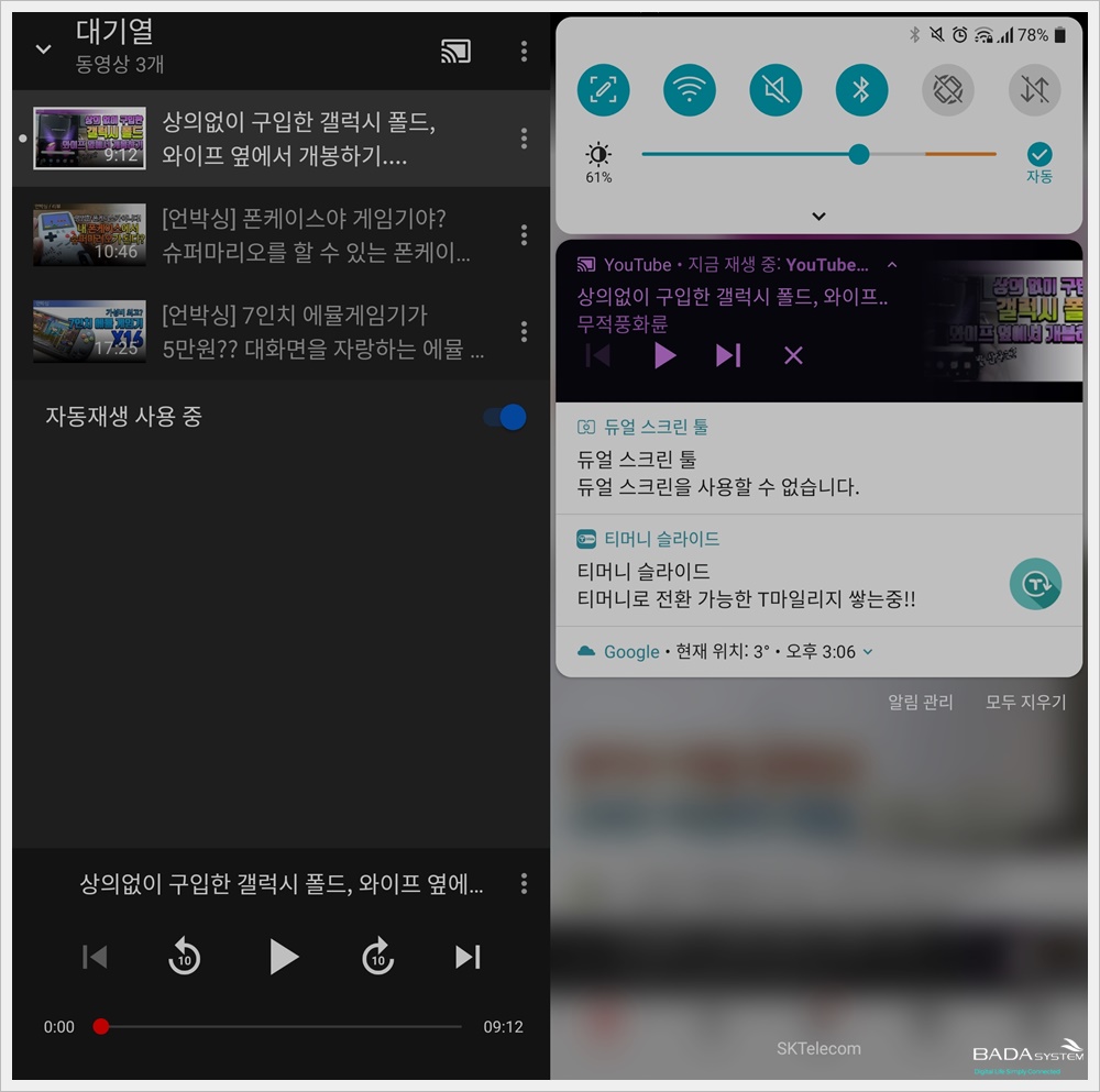 상단 알림 영역에 간단 간당 동영상 정보와 제어 버튼이 표시됩니다.