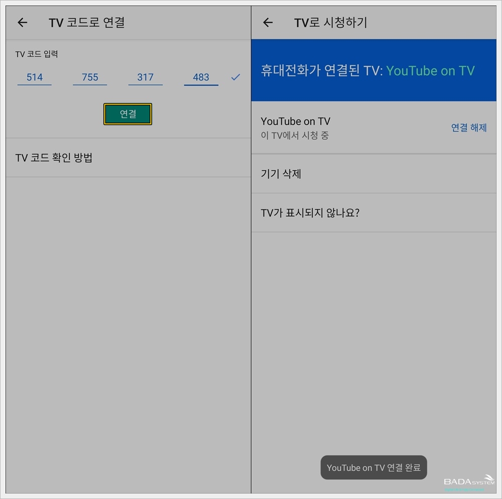 연결이 되면 스마트폰 화면에 " YouTube on TV 연결 완료 " 메시지가 표시됩니다.