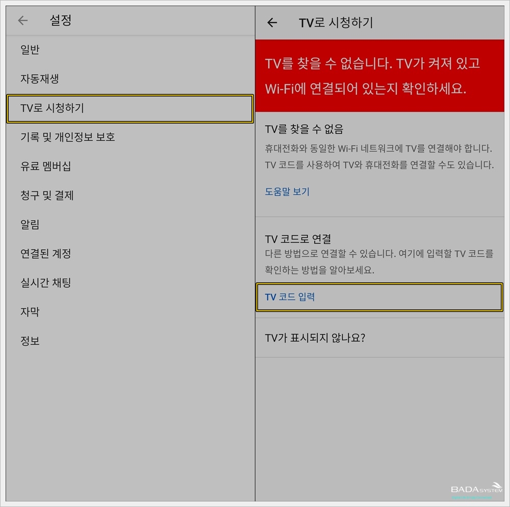 설정 메뉴에서 " TV로 시청하기 - TV 코드 입력 " 누릅니다.