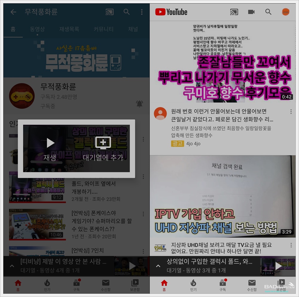 스마트폰에서 영상을 선택하면 " 재생/대기열에 추가 " 두 가지 버튼이 나타납니다.