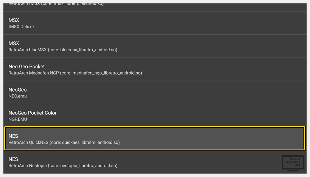 ' RetroArch QuickNES (core: quicknes_libretro_android.so) ' 를 선택합니다.
