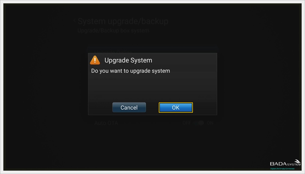 When the download is completed, the message "Upgrade System" appears.