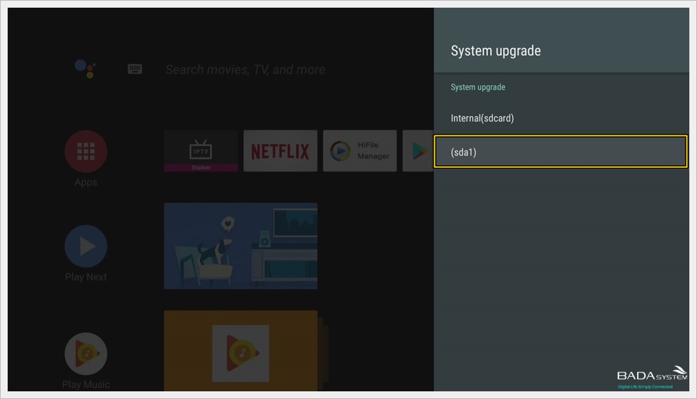 On the "System upgrade" screen, select " (sda1) ".