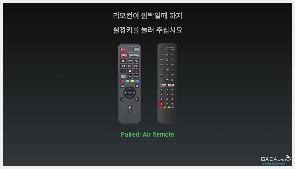 제공된 리모컨에 따라서 하단에 " Pairing: " 부분에 제공된 리모컨의 모델명이 나타납니다.