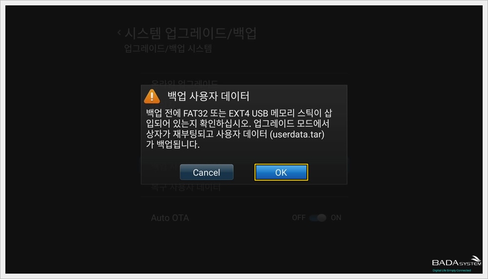 백업 사용자 데이터 메시지가 나오면 " OK "를 눌러 주세요.