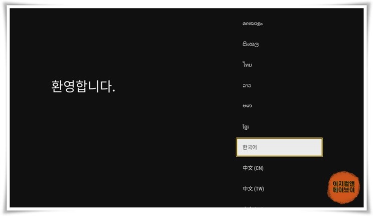 리모컨 방향키로 아래로 쭉 내려 ' 한국어 ' 를 선택해 주세요.