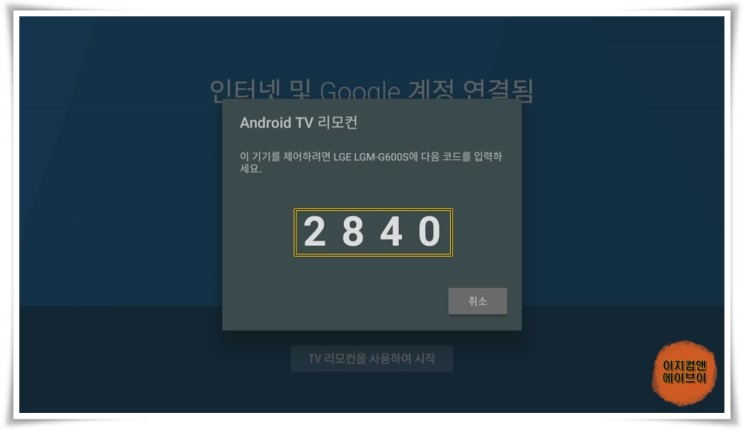 ' Android TV Remote Control ' 앱이 자동 실행되고 ' 안드로이드 TV 리모컨을 사용해 주셔서 감사합니다. ' 메시지가 나오면 ' 동의 및 계속 ' 을 눌러 주세요.