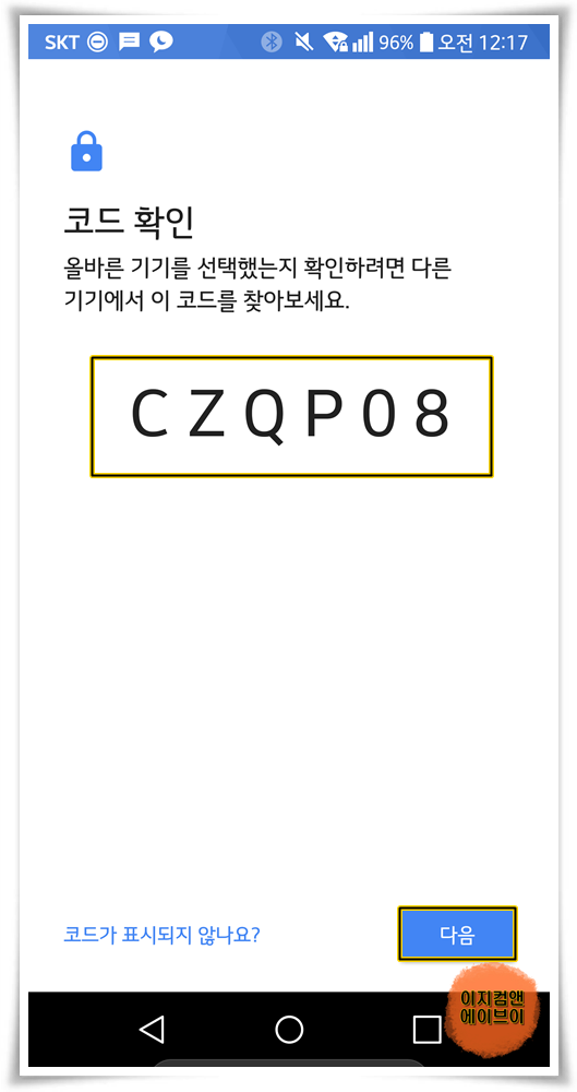' 코드확인 ' 메시지가 나오면 U5와 기기코드가 일치하는지 확인 하고 ' 다음 ' 을 눌러주세요.