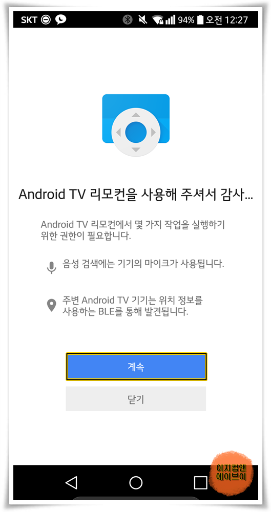 ' 안드로이드 TV 리모컨을 사용해 주셔서 감사합니다. ' 메시지가 한 번 더 나오면' 계속 ' 을 눌러 주세요.