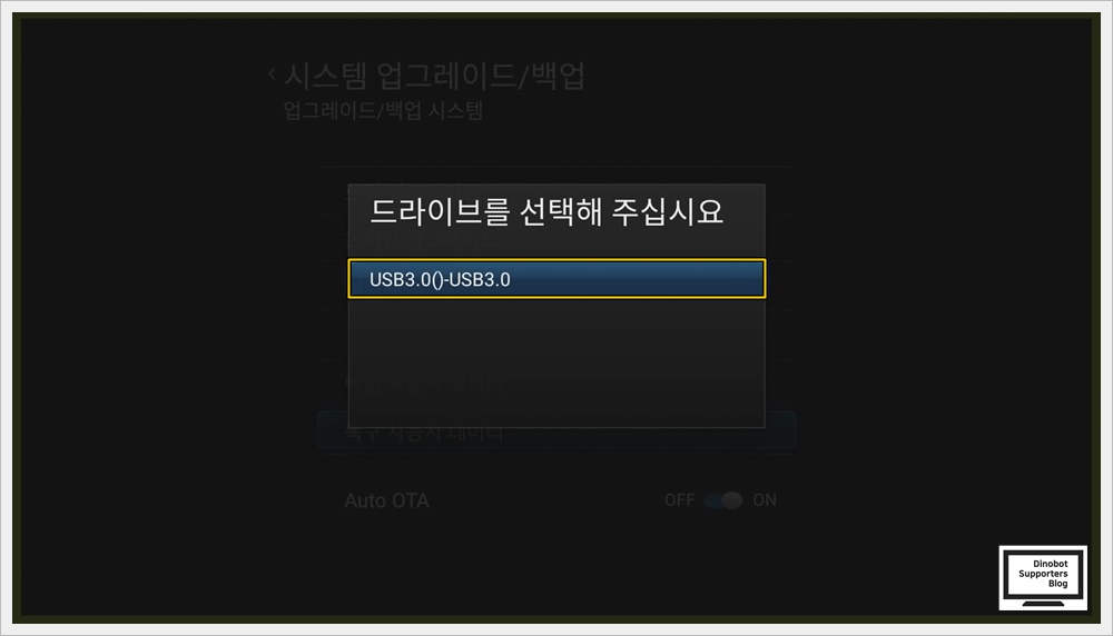 ' 드라이브를 선택해 주십시요 ' 메시지가 나오면 ' update.zip ' 파일이 들어 있는 USB 메모리 스틱을 선택해 주시면 됩니다.