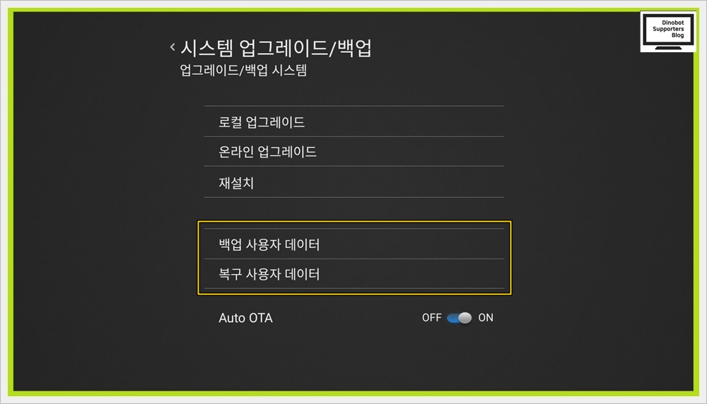 · 백업 사용자 데이터:USB 메모리 스틱에 사용자 시스템 데이터를 저장 합니다. (백업 되는 정보는 ‘ ATV & 안드로이드 설정 / 구글 로그인 정보 / 설치된 앱 & 앱의 로그인 정보 ’ 저장 됩니다.)