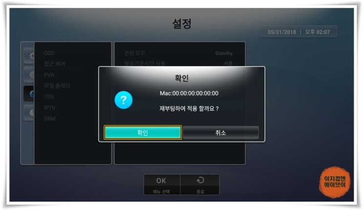 확인을 누르시면 재부팅이 되고 맥주소가 적용 됩니다.