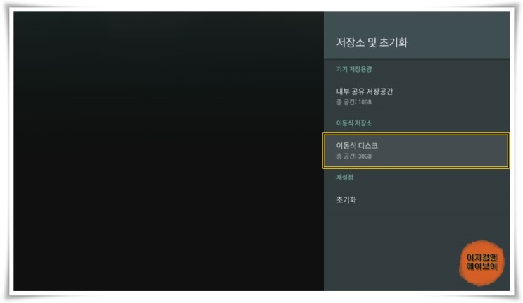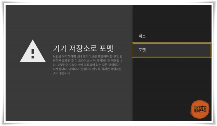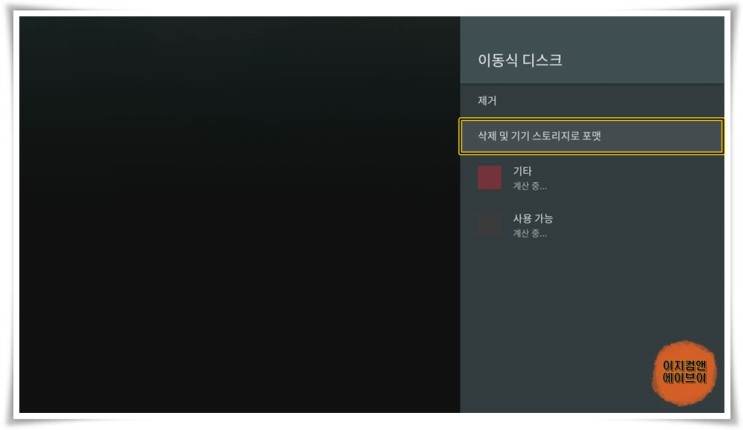 ' 삭제 및 기기 스토리지로 포맷 ' 항목을 통해서 USB 이동식 디스크의 포맷이 가능 합니다.