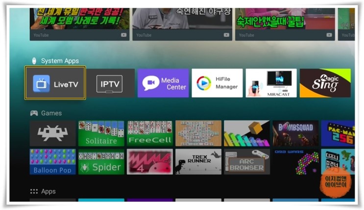 USB를 본체에 연결 하시고 준비 되셨으면 시스템 앱에서 ' Live TV ' 앱을 실행 합니다.