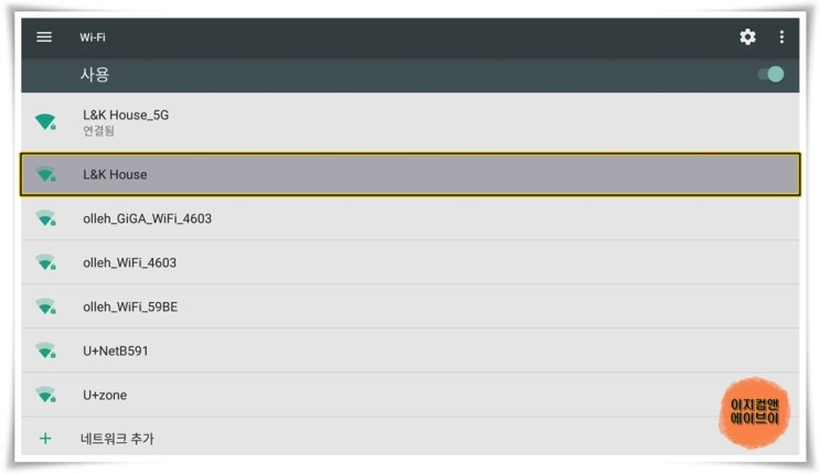 연결하기 원하시는 와이파이 네트워크 아이디를 선택 하시고