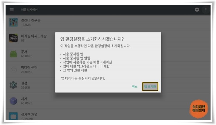 ' 앱 환경설정 초기화 ' 를 누르면 앱 설정을 초기화 할 수 있습니다.