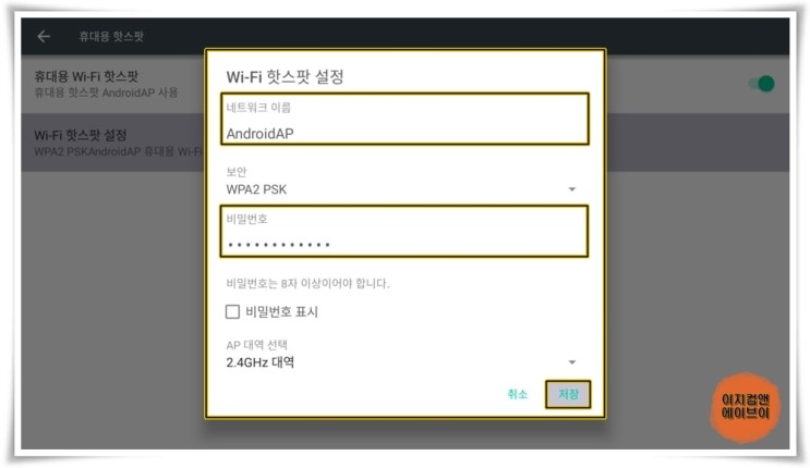 네트워크 이름과 비밀번호를 입력 해주시고 ' 저장 ' 을 눌러 주시면 됩니다.
