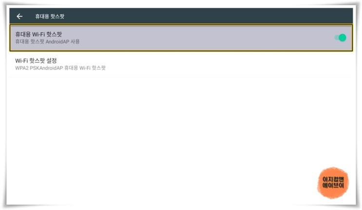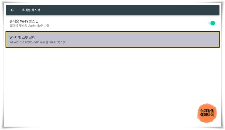 ' 휴대용 Wi-Fi 핫스팟 ' 을 활성화 하면 휴대용 핫스팟 설정이 가능 합니다.
