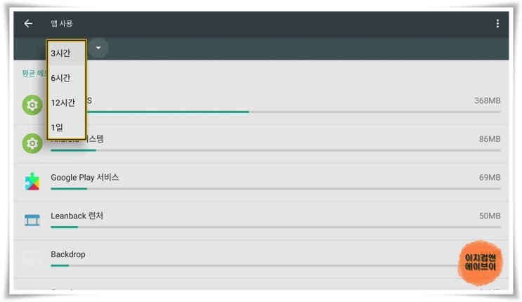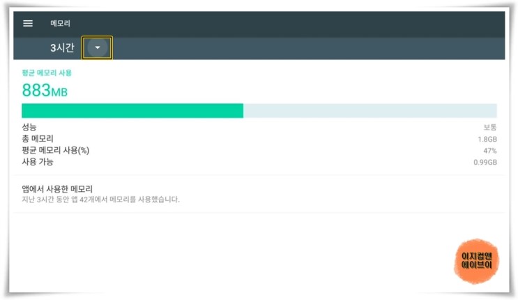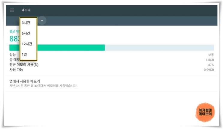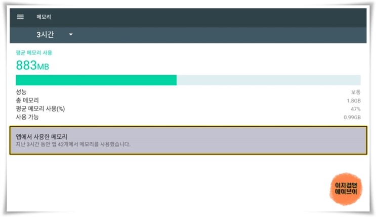 ' 앱에서 사용한 메모리 ' 항목을 통해서 앱별 메모리 사용량 확인이 가능 합니다.