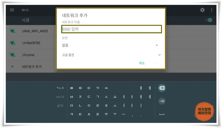 연결을 원하는 와이파이 네트워크 이름과 비밀번호를 입력 하시면 됩니다.
