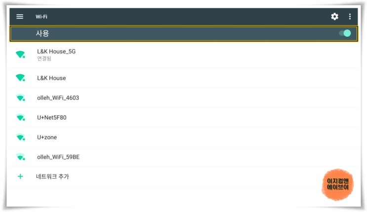 ' 사용 ' 을 눌러서 와이파이(무선 인터넷)를 켜고 끌 수가 있습니다.