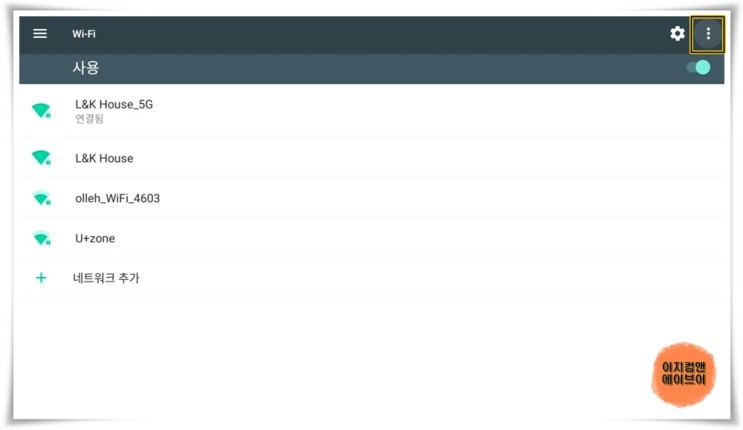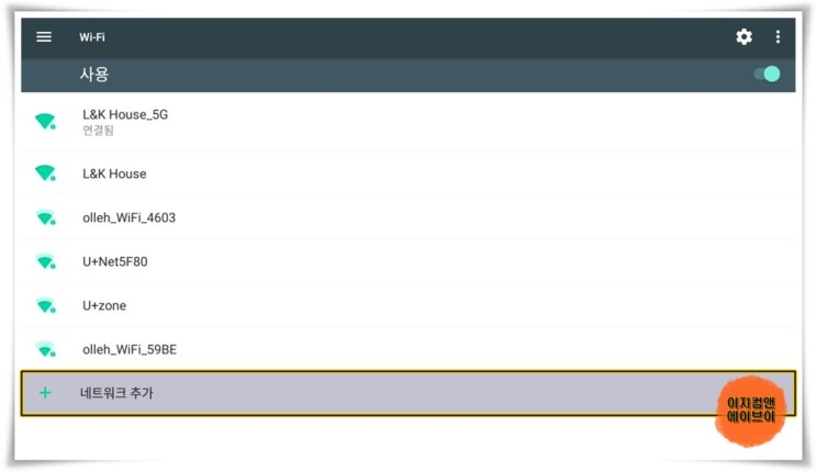 ' 네트워크 추가 ' 를 눌러서 와이파이 목록에 안 보이는 숨겨져 있는 나만의 와이파이 연결도 가능 합니다.