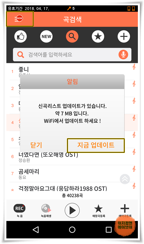 신곡이 있을 경우에는 상단 메뉴 버튼에 ' NEW ' 아이콘이 뜨며 업데이트 메뉴가 나옵니다.