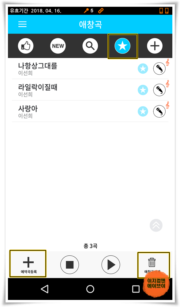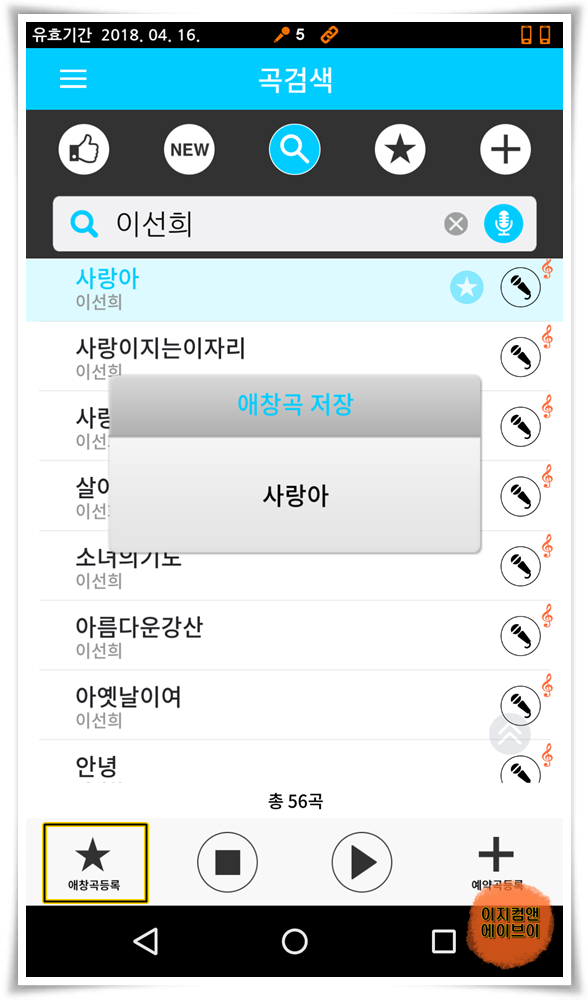 예약곡 등록과 같은 방법으로 원하는 곡제목을 길게 눌러서 ' ★애창곡등록 ' 버튼을 누르면 애창곡 저장도 가능 합니다.