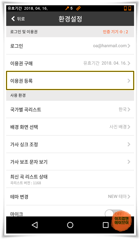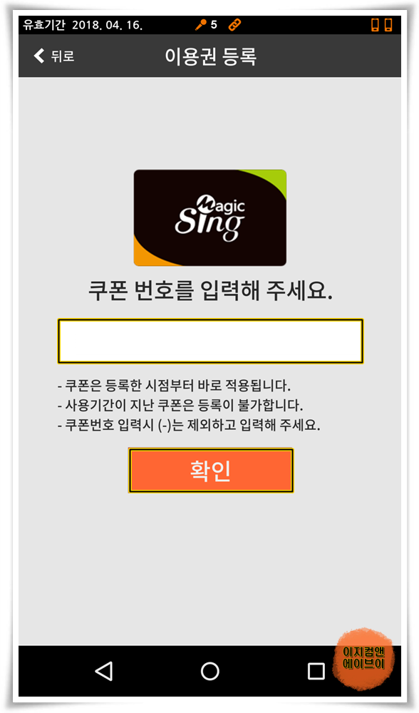 매직씽 MP30 블루투스 노래방 마이크 구매 시 제공 받은 쿠폰 번호를 입력하고 확인을 이용권이 자동 등록 됩니다.