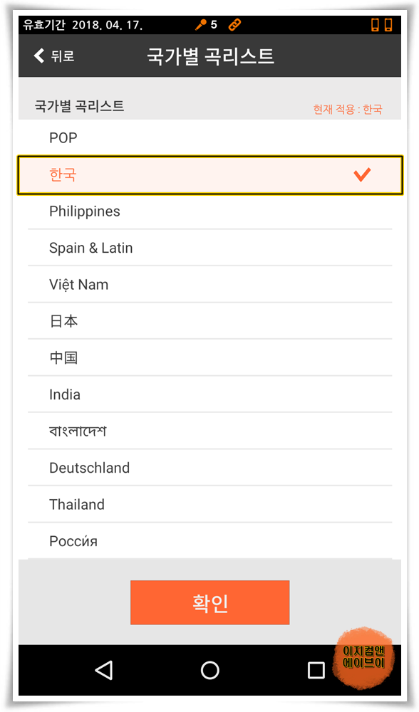 ' 국가별 곡리스트 ' 를 눌러서 다양한 나라의 노래를 불러 볼 수 있습니다.
