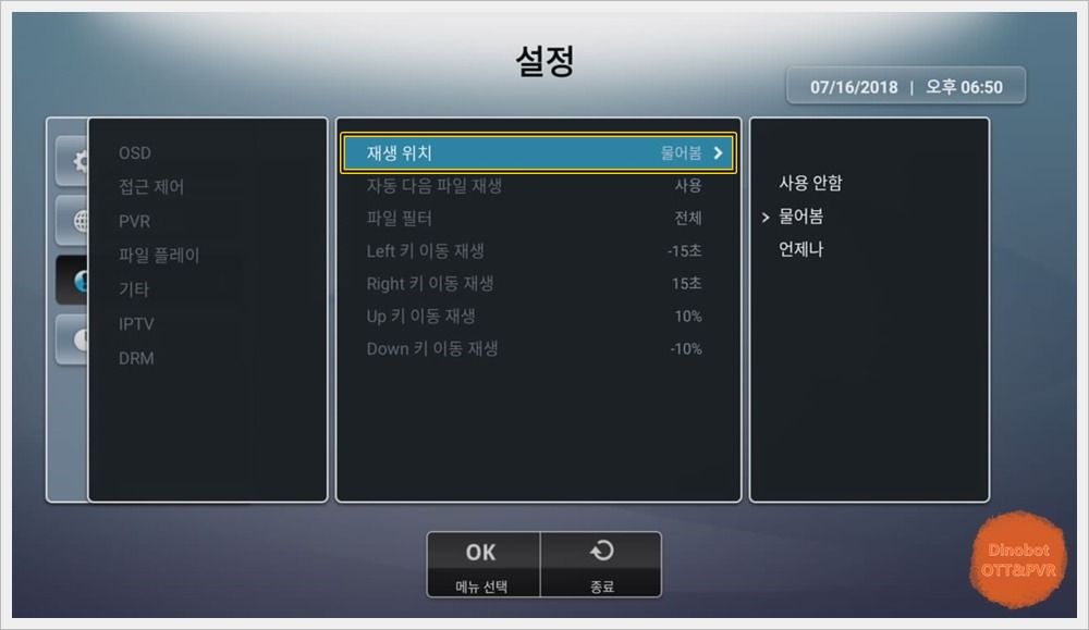 ' 재생 위치 ' 설정은 이전에 보던 위치에서 부터 시청할지 처음부터 시청 할 것인지를 설정 합니다.