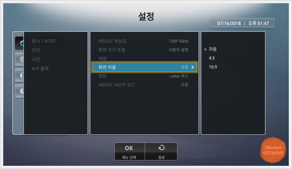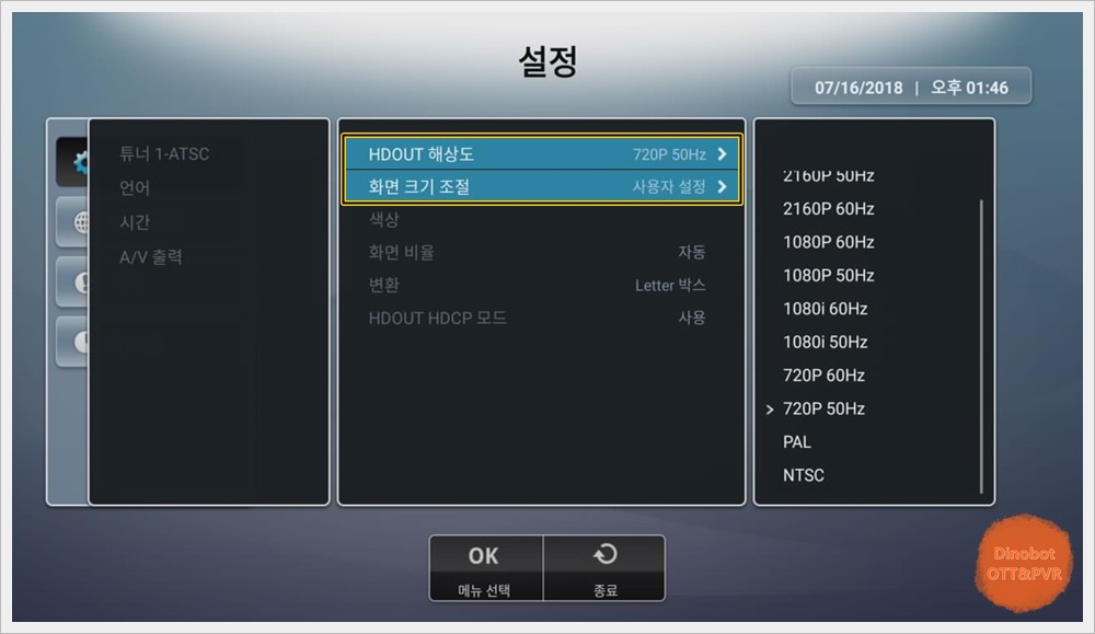 ' HDOUT 해상도 ' 설정은 화면 해상도 설정으로 ATV 설정에 동일한 옵션이 있어서 설정하지 않습니다.