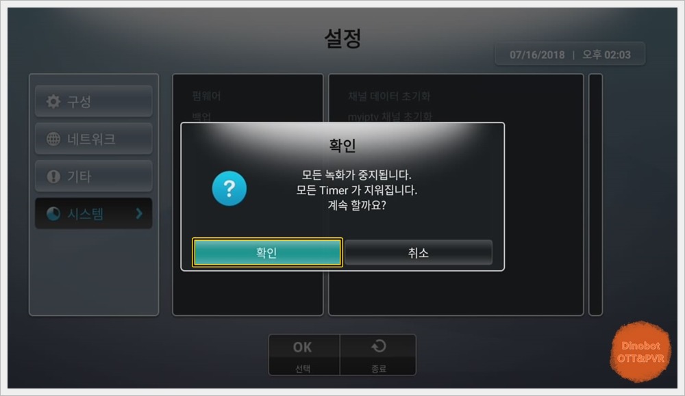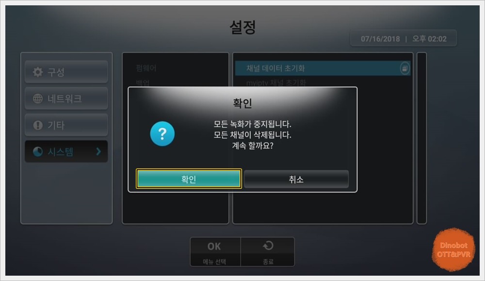 ' 확인 ' 을 누르면 채널 데이터 초기화가 가능 하며 채널 데이터 초기화 시에는 녹화 기능이 중지 됩니다.