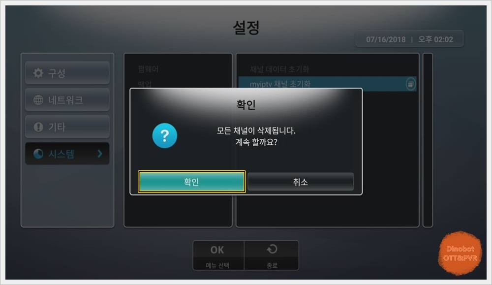 ' 확인 ' 을 누르면 모든 IPTV 채널을 삭제 합니다.