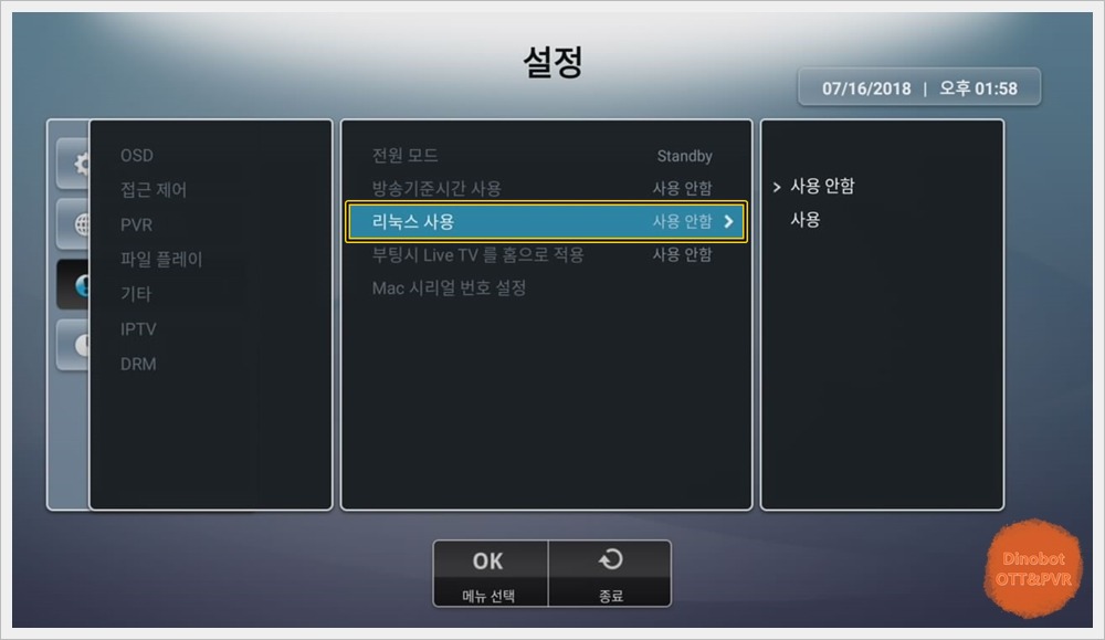 ' 리눅스 사용 ' 설정은 리눅스 사용에 관한 설정으로 ATV 설정에 동일한 옵션이 있어서 설정하지 않습니다.