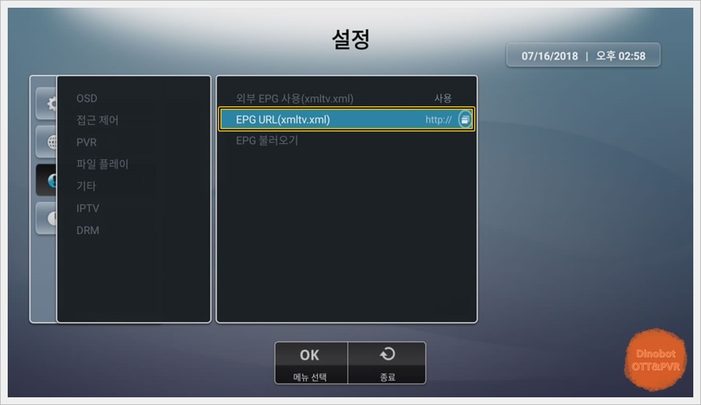' EPG URL ' 을 누르면 외부 EPG 데이터 수신이 가능한 웹페이지 주소 입력이 가능 합니다.