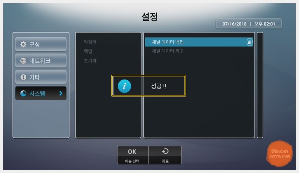 ' 성공 ' 이라고 뜨면 채널 데이터가 제대로 백업 된 것 입니다.