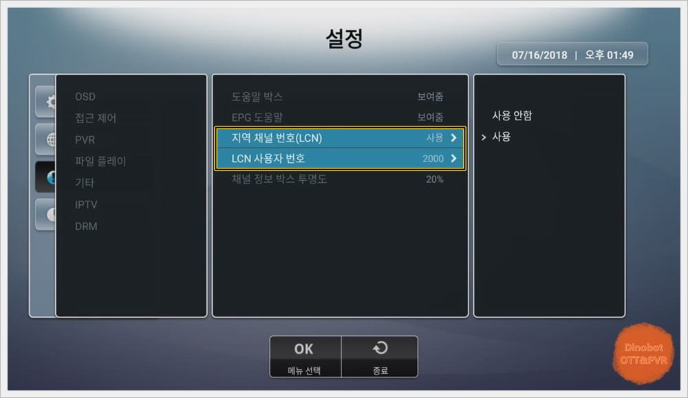 ' 지역 채널 번호(LCN) 설정은 ' 사용 안함 ' 으로 표시해도 ' 사용 ' 으로 자동 변경 됩니다.