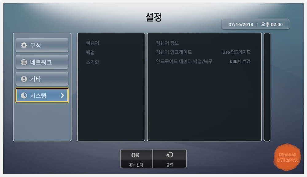 ' 펌웨어 ' 설정은 펌웨어 업그레이드와 백업에 관한 설정으로 ATV 설정에 동일한 옵션이 있어서 설정하지 않습니다.