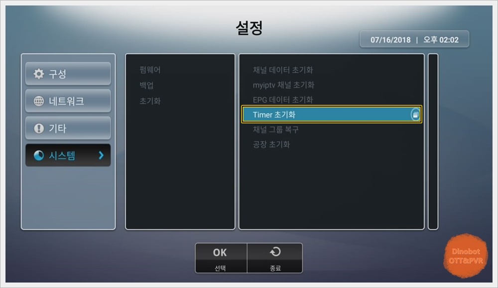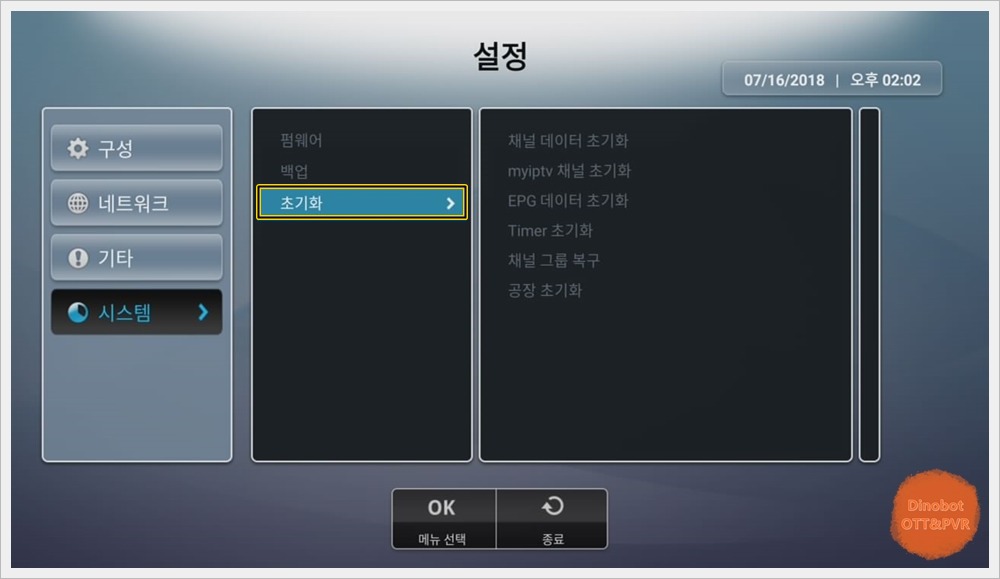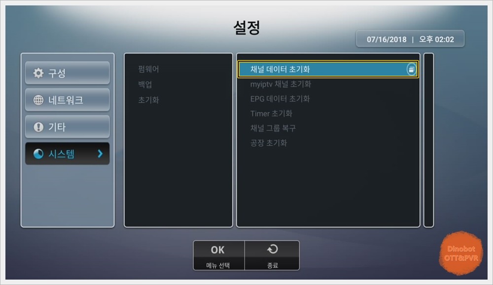 ' 초기화 ' 설정을 통해서 채널 데이터 및 EPG 데이터 초기화가 가능 합니다.